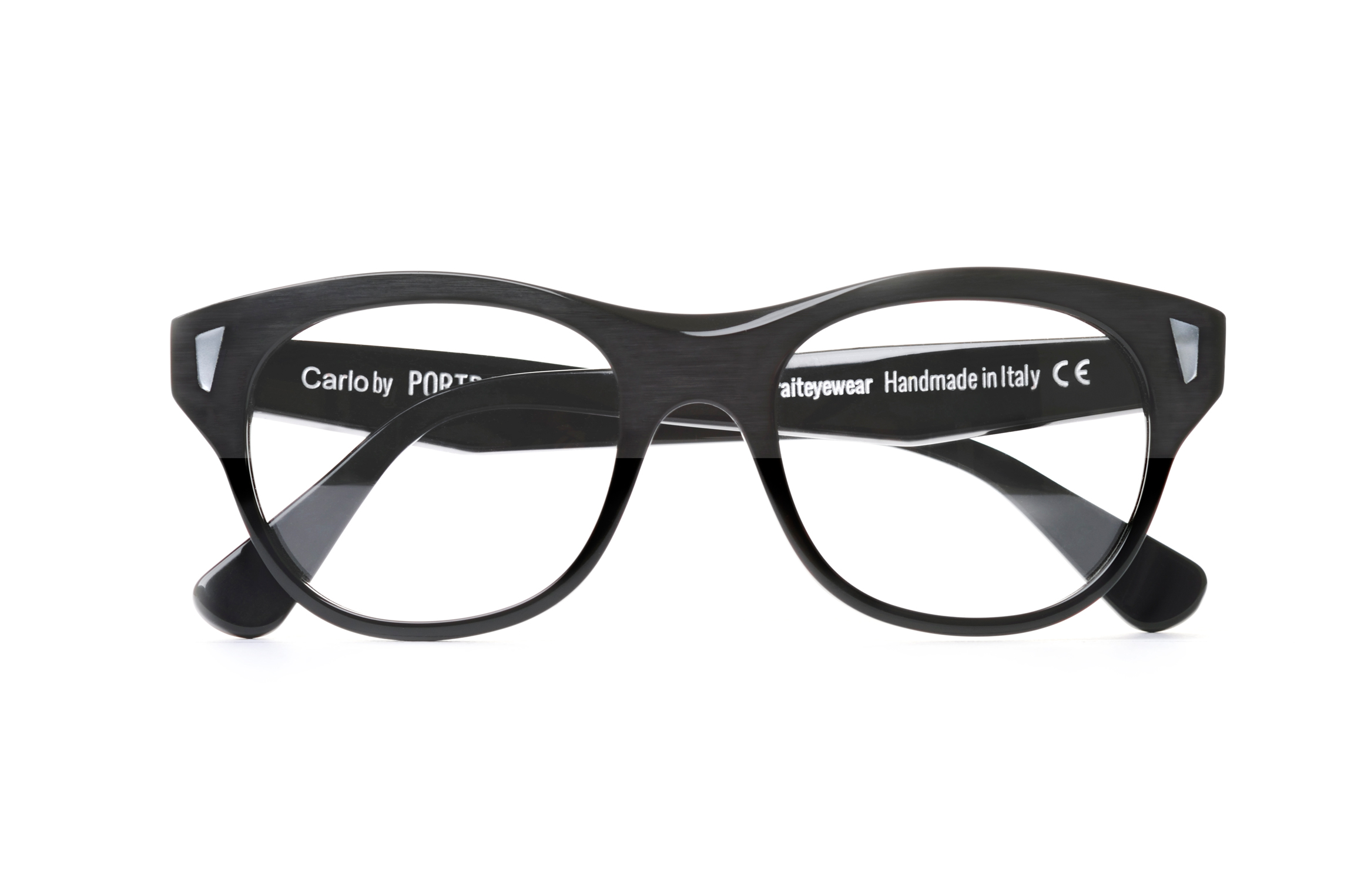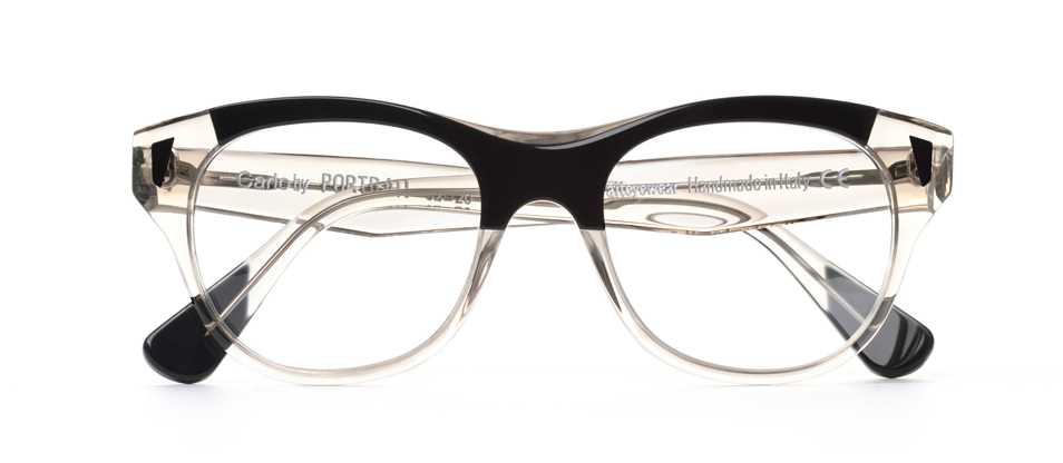 Smoky transparent frame + black upper rim outline. Black inlays. Smoky transparent temples + black ends. Glossy finish. Handmade in Italy Eyeglasses.