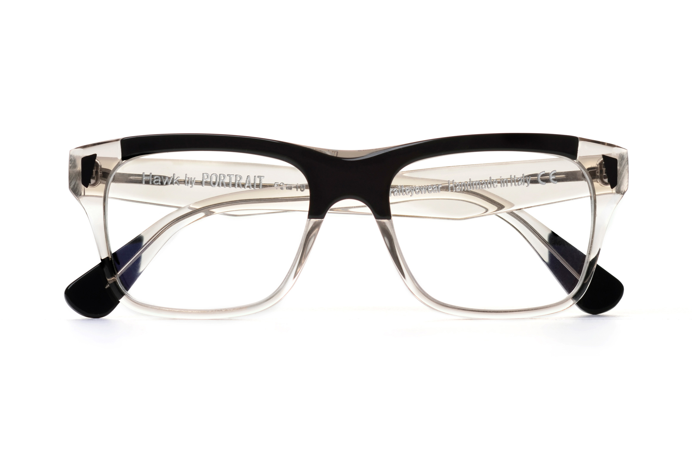 Smoky transparent frame + black upper rim outline. Black inlays. Smoky transparent temples + black ends. Glossy finish. Handmade in Italy Eyeglasses.