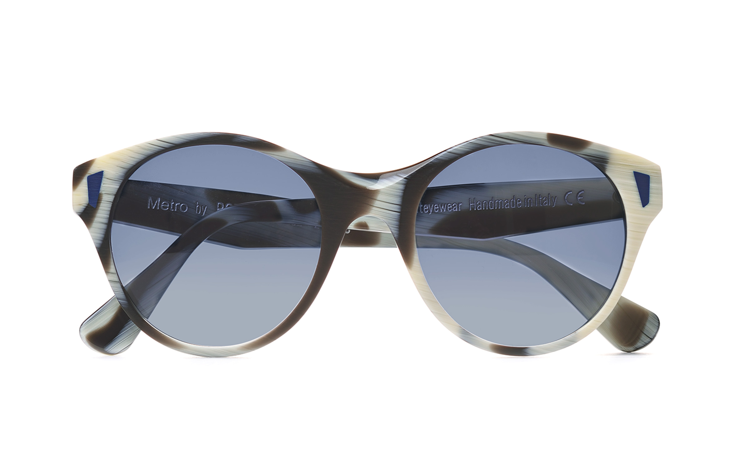 Brushed finish (bas-reliefs are glossy). Gradient - blue lenses. Handmade in Italy Sunglasses.