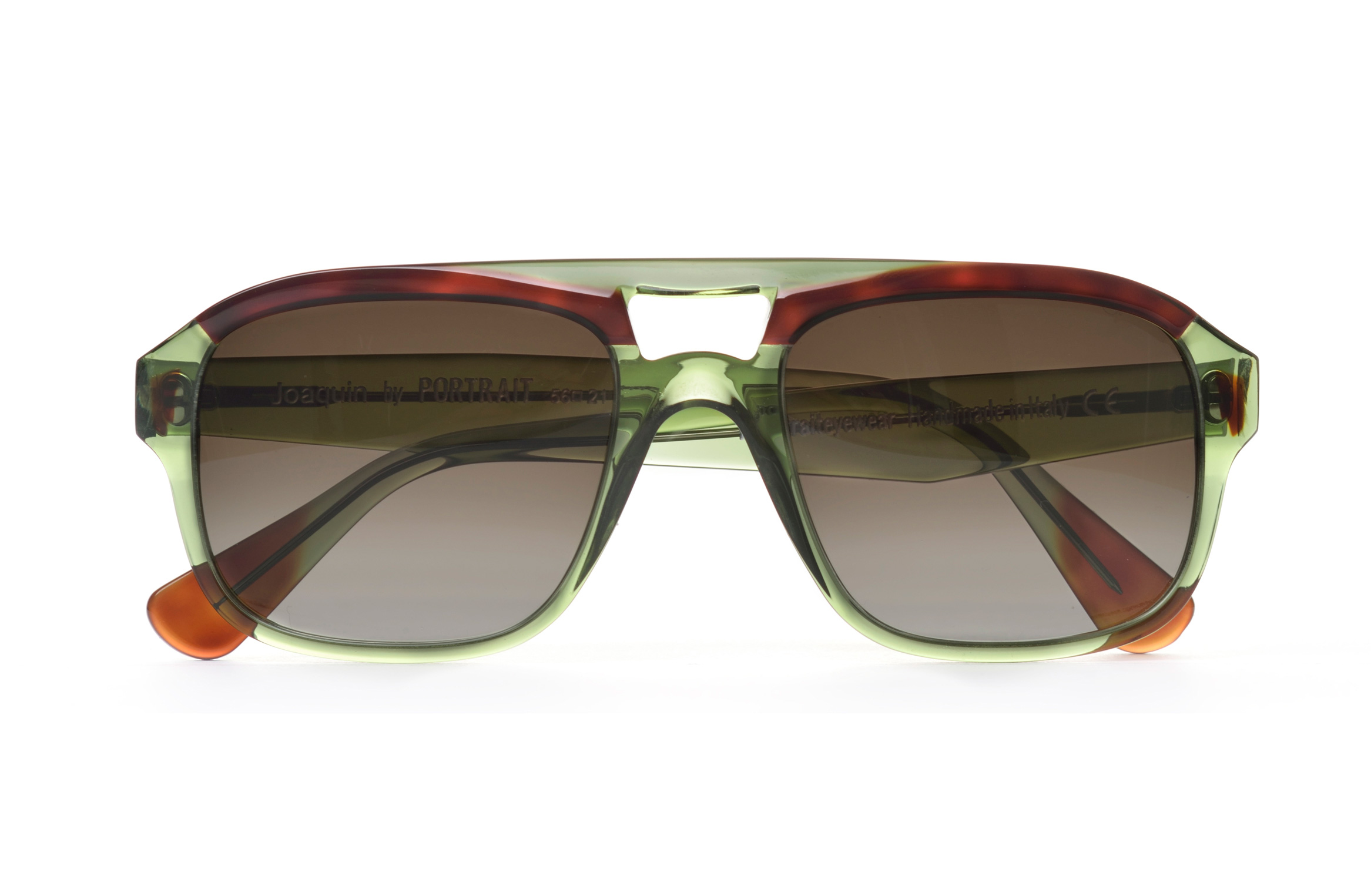 Translucent dark green frame + Tortoise upper rim outlines. Tortoise inlays. Translucent dark green temples + Tortoise ends. Glossy finish. Brown to grey lenses. Handmade in Italy Sunglasses.