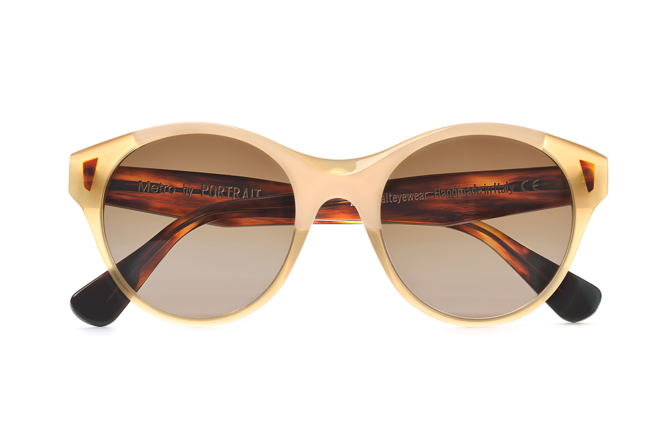 Translucent honey frame + Opaque sand upper rim outline. Tortoise inlays. Tortoise temples + blue ends. Glossy finish. Pale-pink to brown lenses. Handmade in Italy Sunglasses.